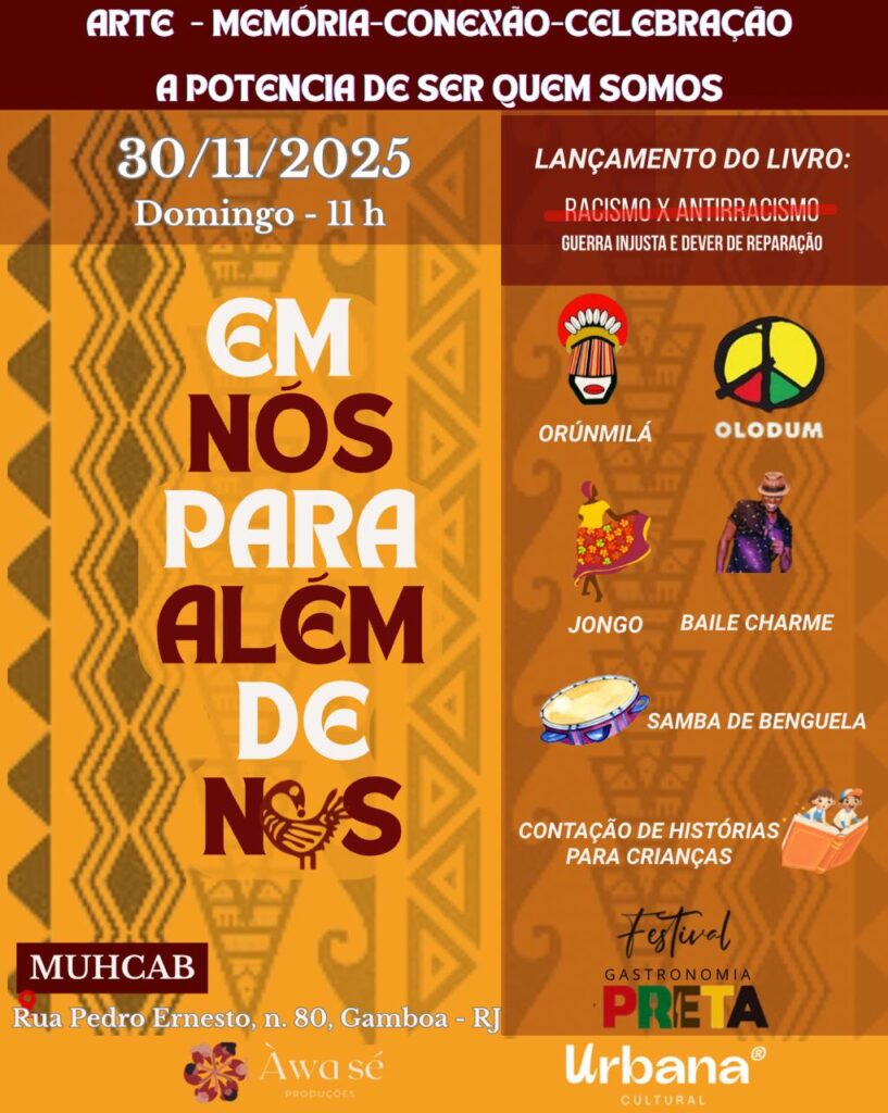 A primeira edição do projeto Em Nós Para Além De Nós, idealizado pela atriz, produtora e comunicadora Cinnara Leal a partir de um convite de seu irmão, o escritor e doutor em Filosofia Carlos Leal, será realizada no dia 30 de novembro. O evento, gratuito, celebra a existência, a resistência, a ancestralidade e o protagonismo do povo negro no Brasil, atuando como um movimento de reparação simbólica e fortalecimento comunitário. A programação começa às 11h, na Praça da Harmonia, com cortejo afro de celebração unindo os Blocos Olodum e Òrúnmilá, e segue para o Museu da História e da Cultura Afro-Brasileira (Muhcab), com atrações que se estendem até as 20h.