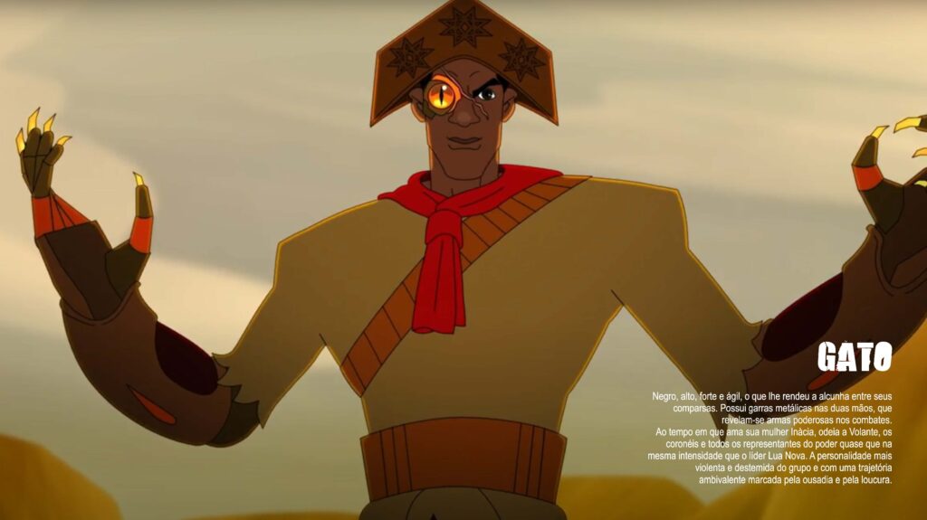 Gato ama profundamente sua mulher Inácia e odeia a Volante, os coronéis e todo representante do poder quase com a mesma intensidade de Lua Nova. É o mais violento e destemido do grupo, com trajetória marcada pela ousadia e loucura.